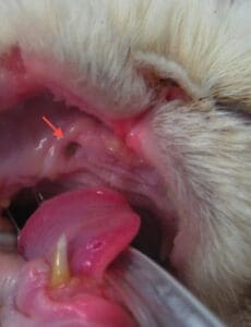 An oronasal fistula is a connection between the mouth and the nose secondary to severe periodontal bone loss and periodontal disease. Nasal discharge, sneezing, and bad breath are often the result of oronasal fistulae.