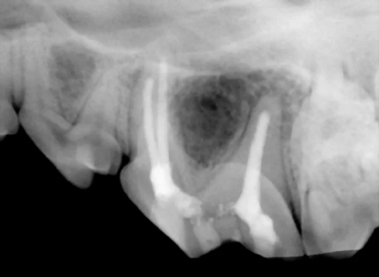 Dental x-rays also help confirm that root canal therapy can be done on a tooth. Sequential x-rays also are taken at each step of the root canal process to help ensure success. To the left is a dental x-ray of a tooth in the middle of the root canal treatment process.