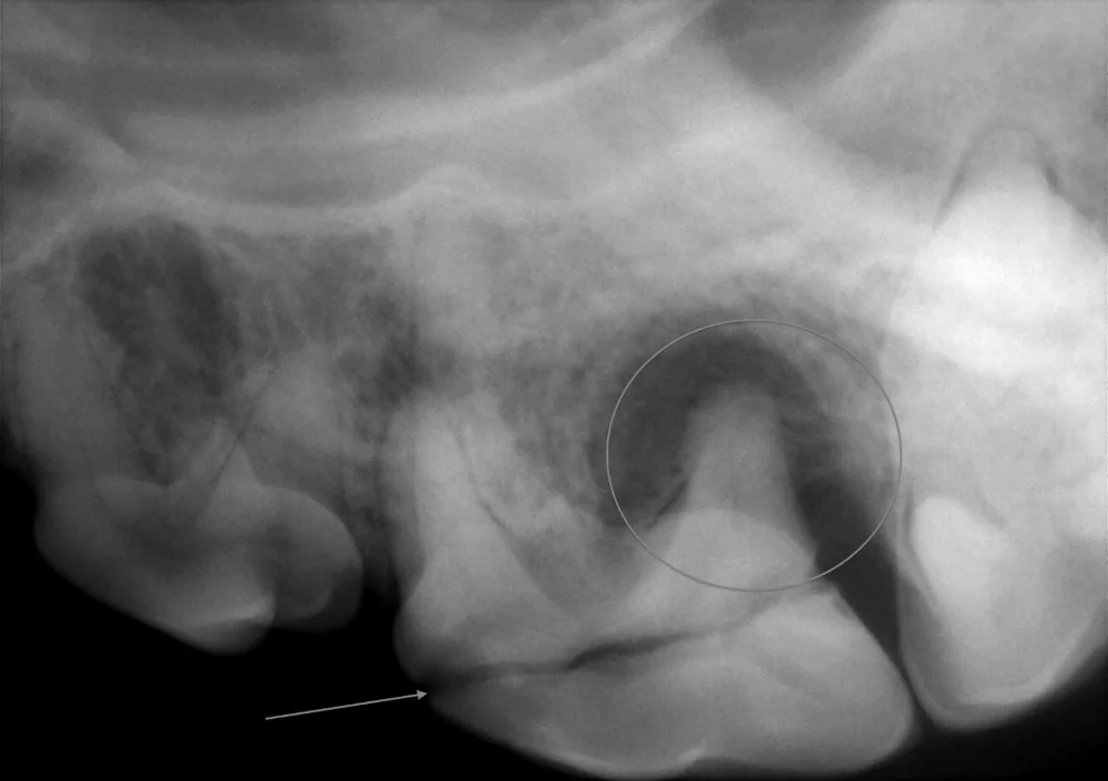 This tooth was fractured at the outside crown of the tooth (see arrow). Dental x-rays of the tooth showed significant infection (dark area circled) at the root of the tooth. Having this information helped plan the proper extraction technique of this badly damaged tooth.
