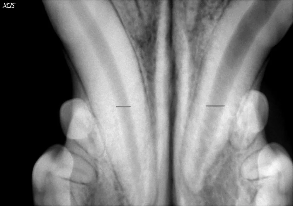 A dog’s lower canine teeth are imaged in this dental x-ray. They both appeared normal on examination. On x-rays inner pulp canal of the tooth is seen as the dark central part running along the tooth. When comparing the two large canine teeth, the widths of the pulp canals should be the same. However, the widths of the teeth, highlighted by the lines on the radiographs, are quite different. The canine tooth on the right has a much wider canal which indicates tooth death in this case. This tooth should be treated with root canal therapy or extraction.