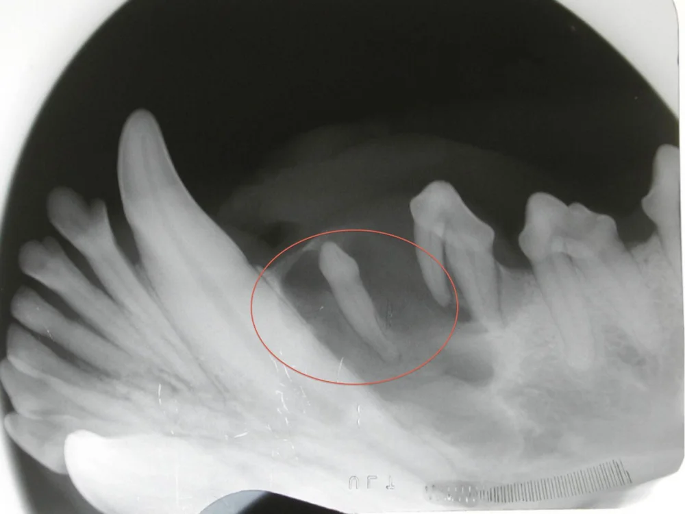 A swelling of the lower jaw was noted on a dog. On examination, no visible tooth in the area was noted. However, dental x-rays show a tooth below the gumline that was unerupted and had caused a cyst to form.