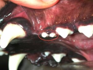 Supernumerary, or extra, teeth may or may not result in secondary problems. The most common problems that may occur because of supernumerary teeth include orthodontic malocclusion or crowding of teeth. Supernumerary teeth should be radiographed (x-rayed) to make sure they are healthy and not causing secondary problems. To the left, two premolar teeth are seen circled where there should only be one.