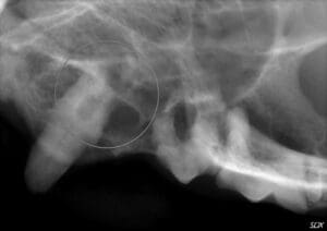 Detailed examination and dental radiographs (x-rays) are the best way to diagnose tooth resorption. Sometimes, resorptive lesions are obvious with visual examination. A red, fleshy lesion at the gum line (seen above left) or degradation on the tooth itself can sometimes be seen on visual exam. However, when tooth resorption is below the gum line, dental radiographs are necessary to diagnose the location and type of resorption. Pictured to the left, a cat tooth shows resorption of the tooth root (circled) only on x-rays. The tooth otherwise appeared normal.